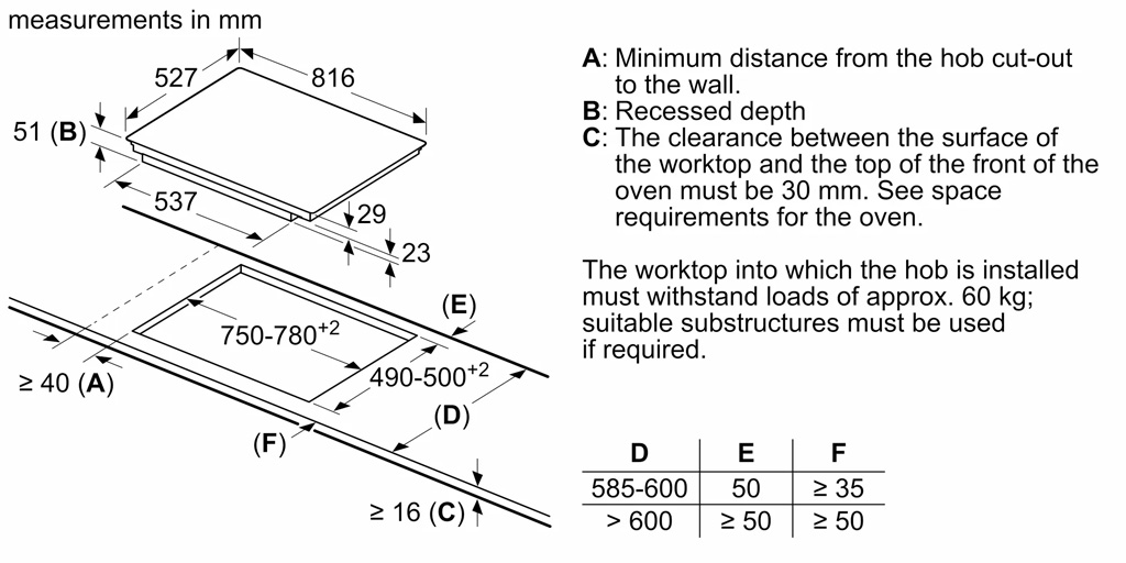 | Kích thước lắp đặt (C x R x S) | 51 x 750 x (490 – 500) mm |