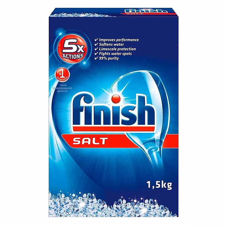 Để ngăn ngừa canxi máy rửa chén được trang bị với 1 chất làm mền nước. Muối rửa bát finish là loại muối đặc biệt không phải muối ăn ( muối bình thường có thể chứa các thành phần không hòa tan, mà còn là dư lượng trên các món ăn và dẫn đến làm hại máy rửa bát, muối rửa bát finish nhập khẩu giúp bảo vệ cả máy rửa chén, bộ lọc và phun vũ khí cũng như đồ sành sứ và dao kéo.